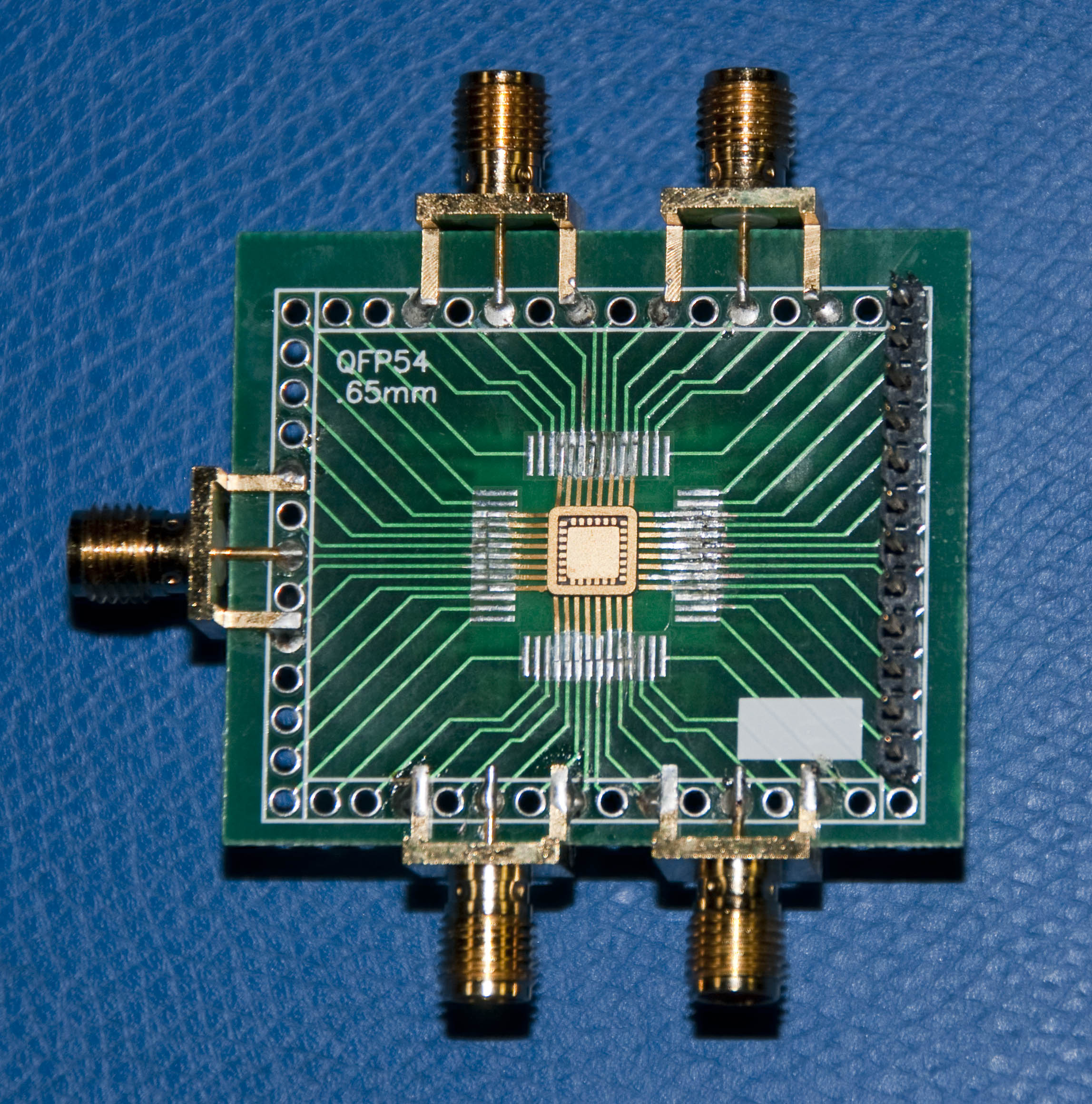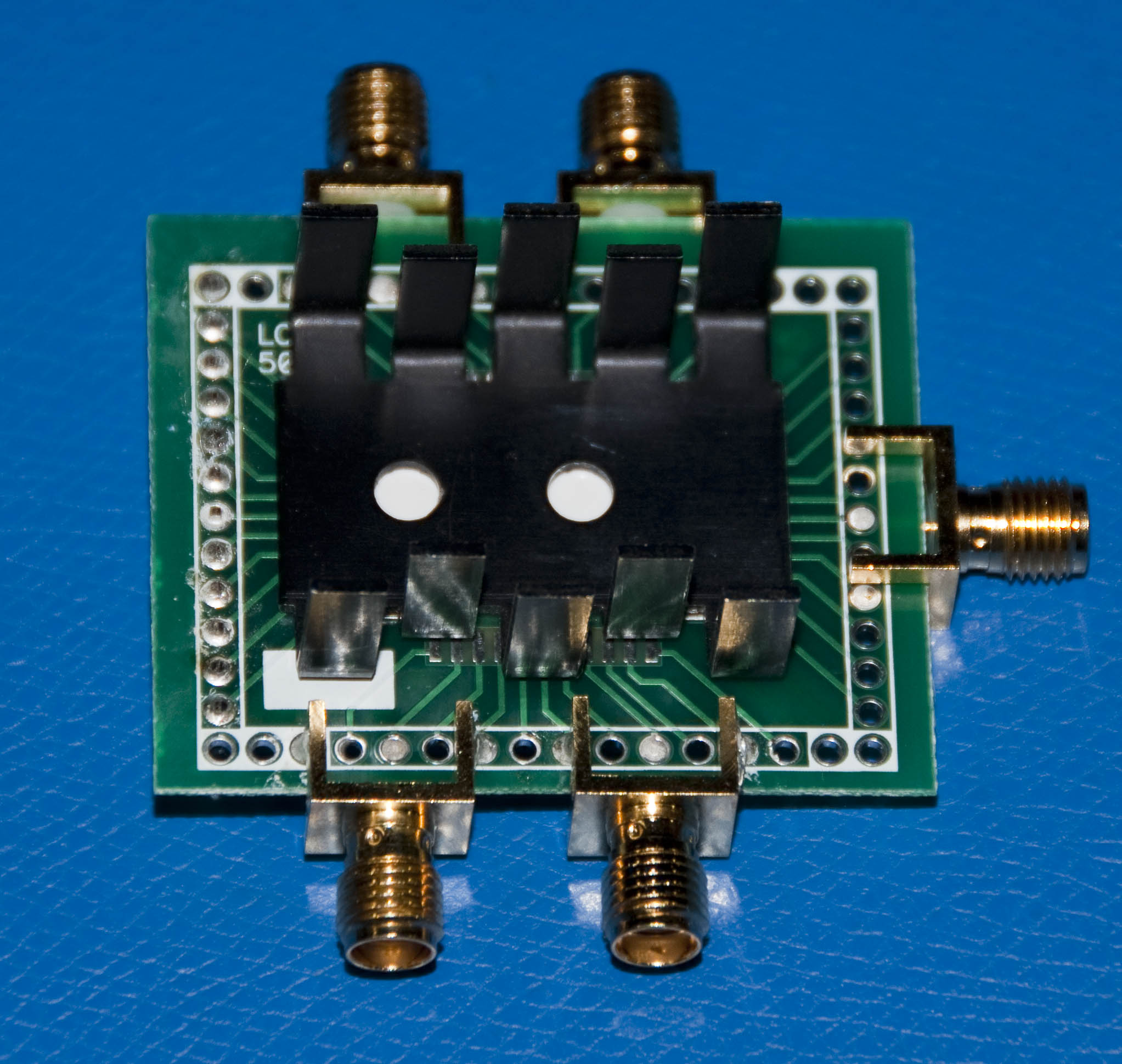 The top and bottom view of the mock-up is shown in the next two photos. The edge mound SMA connectors used in the mock-up are good to 12.5 GHz using flexible cable and 18 GHz using semi-rigid coax cable connections. The header is really a place holder for a dual row ribbon connector to allow twisted pair DC connection to the FET and source and drain resistors. A heatsink is connected to the bottom of the board to provide a good thermal path to the package and the graphene FET so that the temperature can be controlled using a TEC cooler or similar thermal controller. I used a flat pack prototype board for this quick mock-up but a real board would have multiple layers and use microstrip traces for good RF connections between the edge launch connectors and the package.